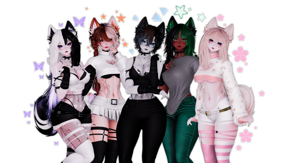 - Menu Toggles: Bangs, Pigtails, Pig+Bangs, Short, Straight, Bald (MR CLEAN???), Ears, Tail, TankTop, TShirt, Sweater, Tops OFF, Bra, Shorts, Skirt, Pants, Bottoms OFF, Panties, Arm Warmers, Leg Warmers, Socks, Shoes, Face ACC, Glasses, Muzzle, Straps, Mask, Head Piercings, Body Piercings, Necklaces, Choker, Chain